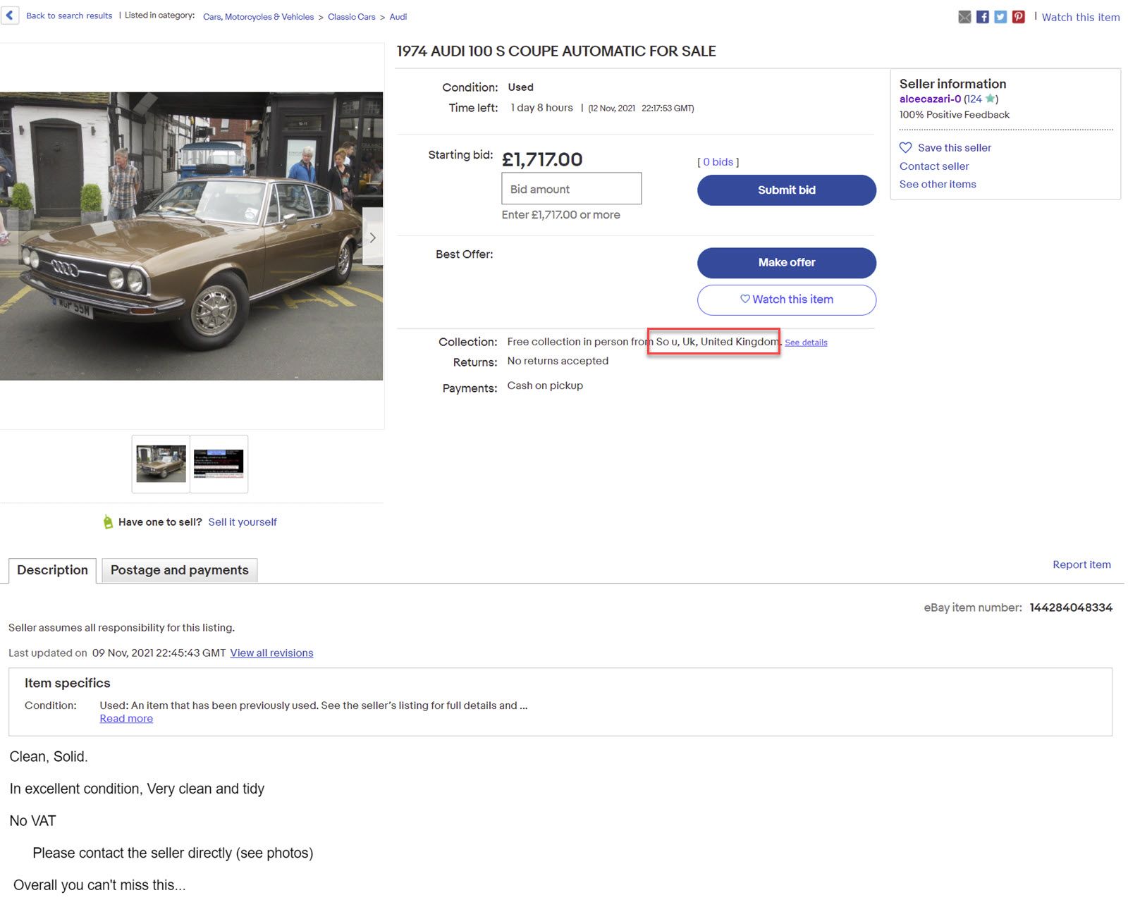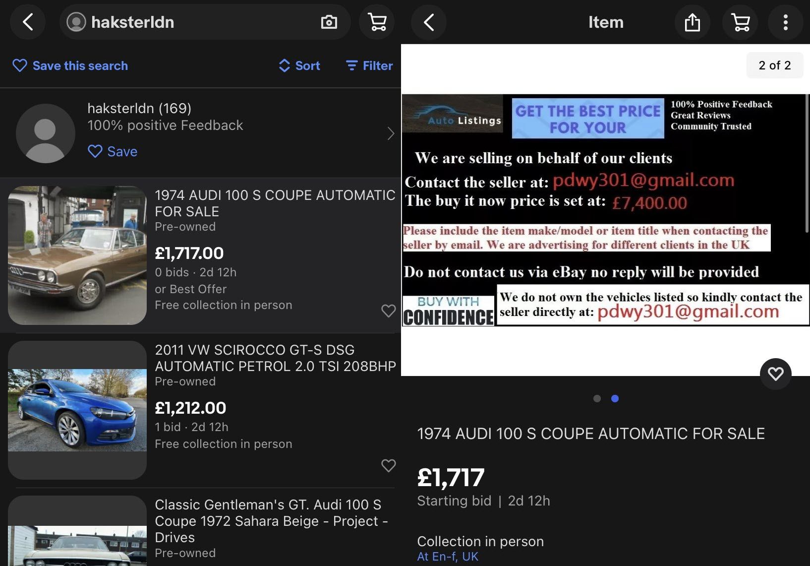As shown with that 1974 Audi, the scammers often use the exact same pictures and titles on every compromised account they take over - not to mention many aspects of the second image always being the same as well.