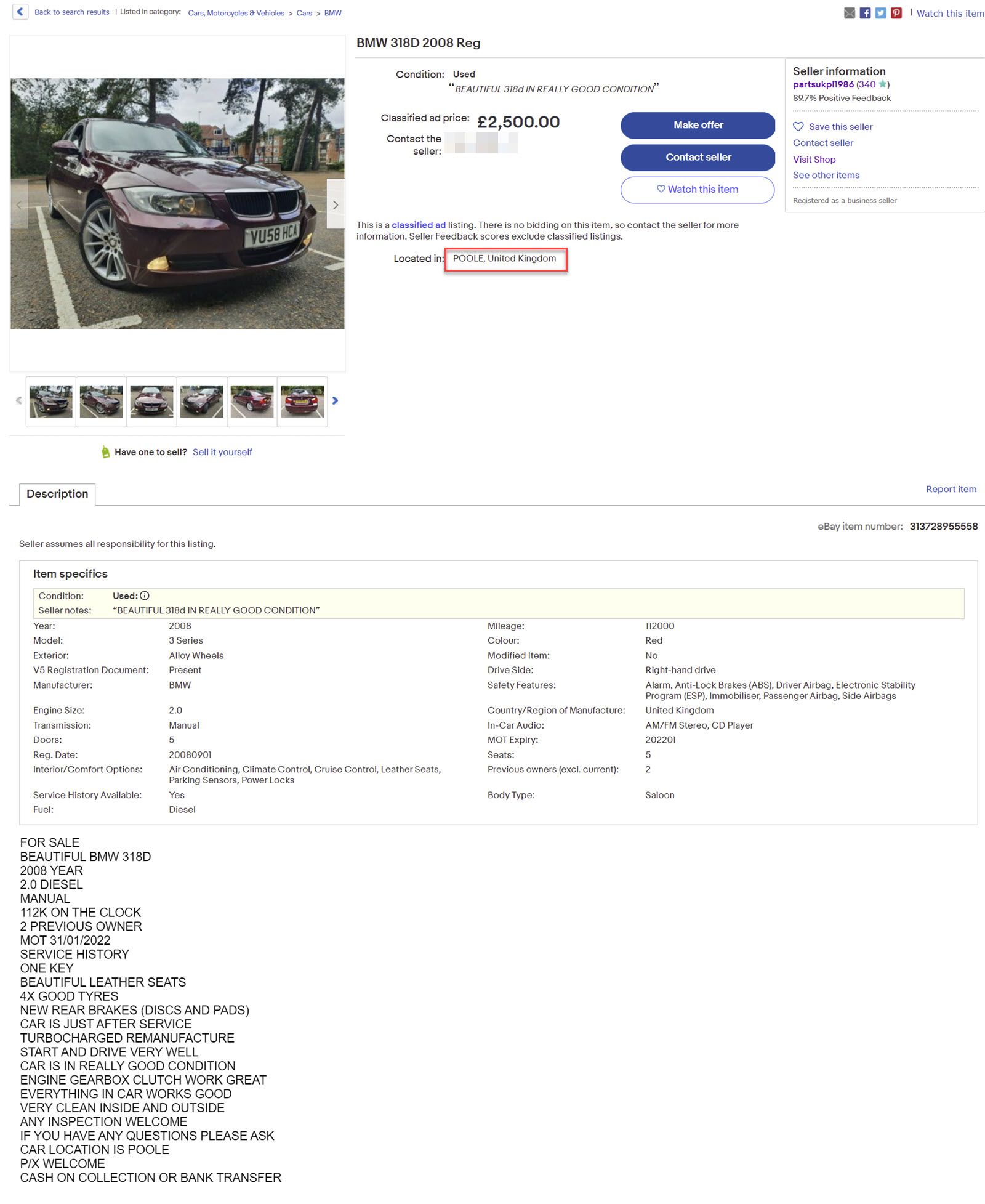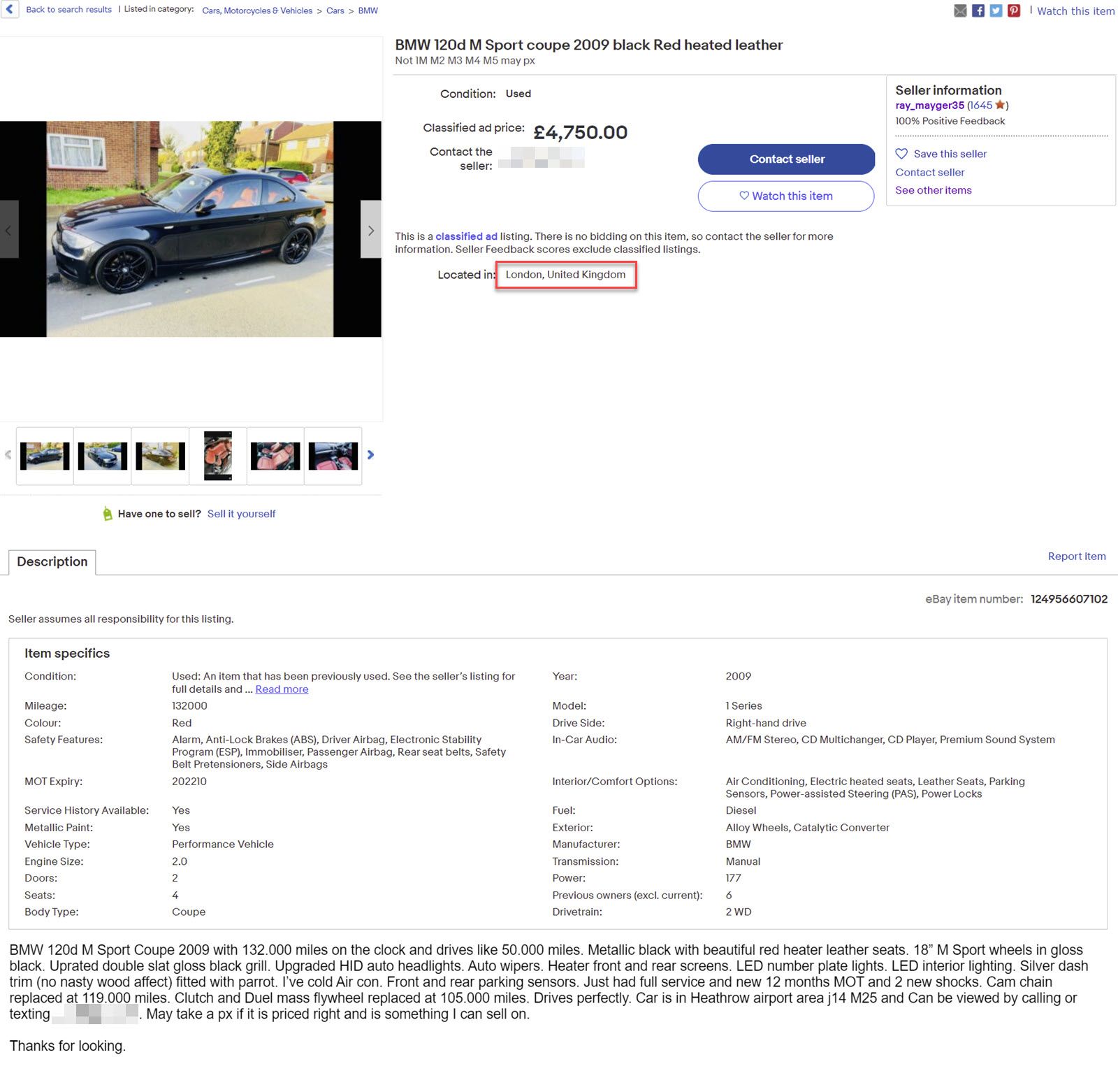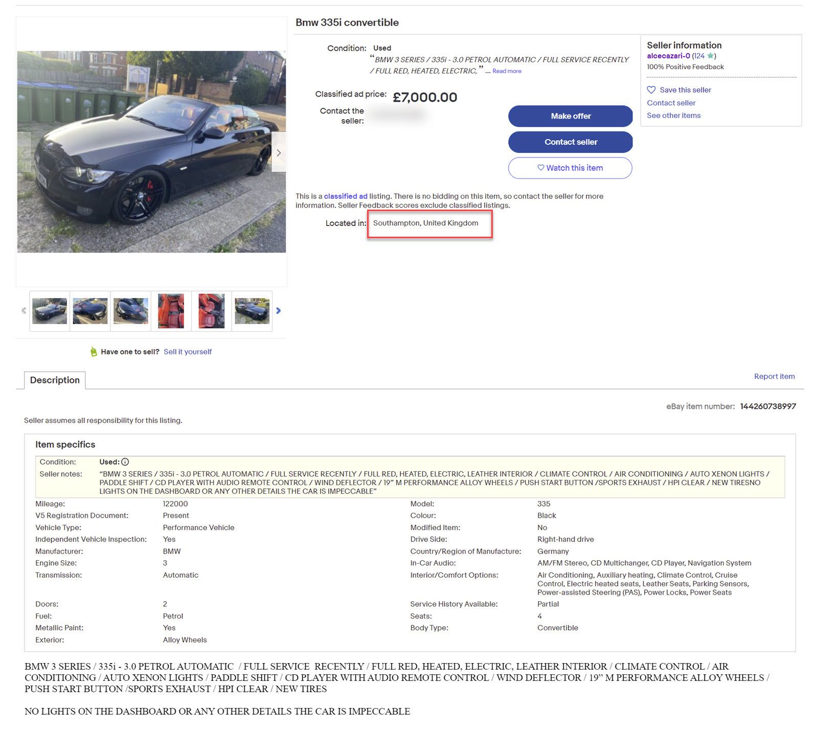 Also notice the locations in all of these examples - the real listings show the full name of a city and United Kingdom, the fake listings show a similar but manipulated city name with some letters removed and/or spaces added, then UK, then United Kingdom.