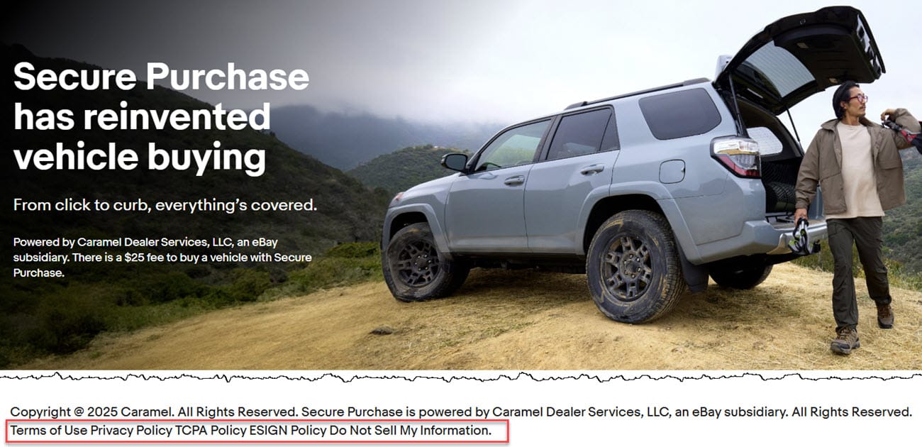 Speaking of terms and conditions, eBay updated their sitewide User Agreement page today to add new language specific to Secure Purchase for vehicles - including that Caramel/eBay now holds a used car dealer license in Washington state as well as Arizona, California, Florida, and Texas.
