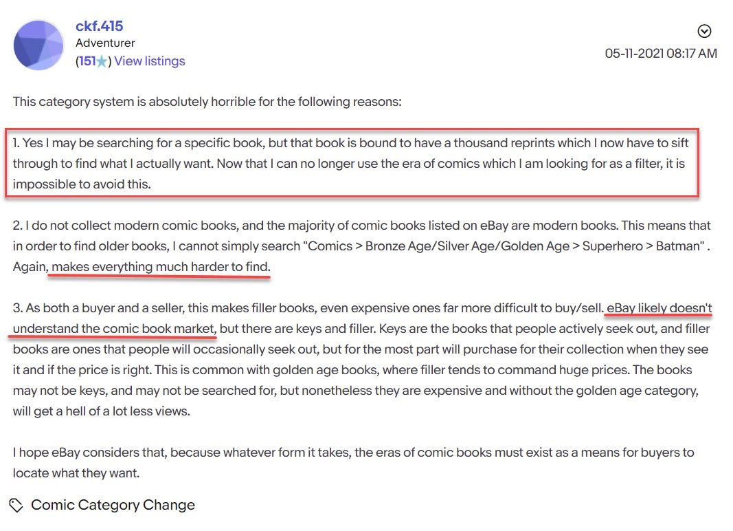 This post from the eBay community highlights the dangers of making massive changes across categories when eBay may not have a complete understanding of what buyers need in terms of search/filter functionality in a particular market.