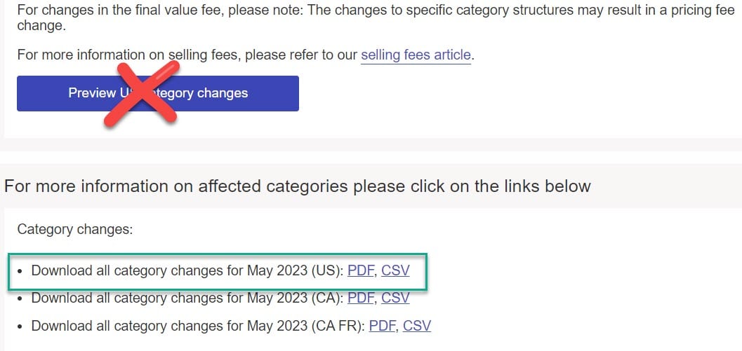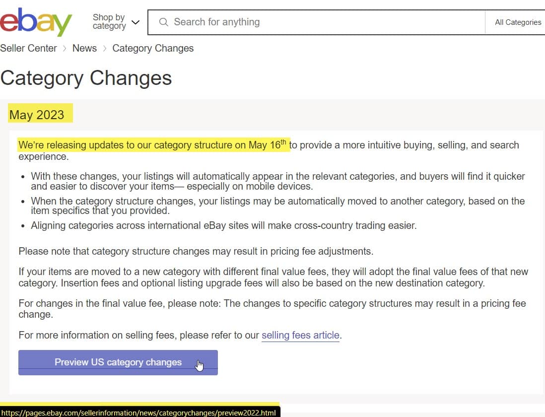 devon@ebay Please have the link in the announcement corrected. The blue bar link on the page that says : "Preview US Category Changes" does not go to the May 2023 changes, it goes to a page with changes from 2022 :