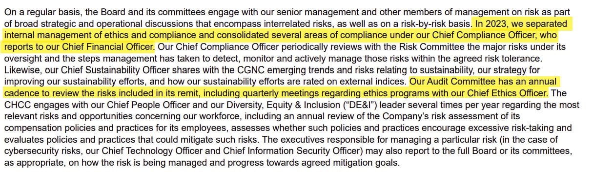 In 2023, we separated internal management of ethics and compliance and consolidated several areas of compliance under our Chief Compliance Officer, who reports to our Chief Financial Officer.