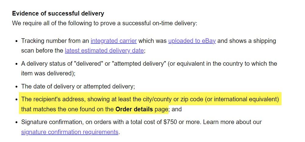 All efforts to get any details about what specific documentation eBay will require/accept as full address proof of delivery have hit a brick wall- eBay simply copies and pastes that exact text every time anyone asks.