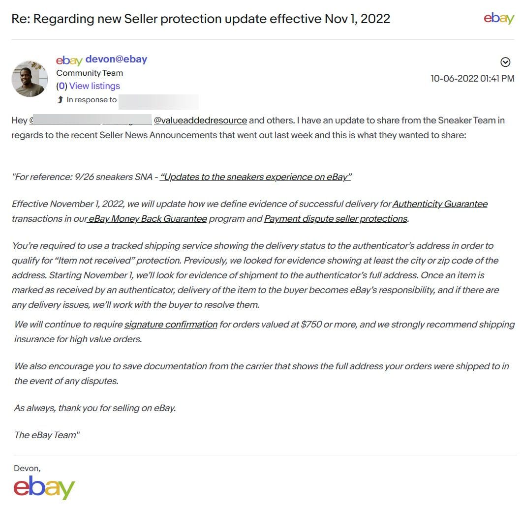 "Effective November 1, 2022, we will update how we define evidence of successful delivery for Authenticity Guarantee transactions in our eBay Money Back Guarantee program and Payment dispute seller protections.