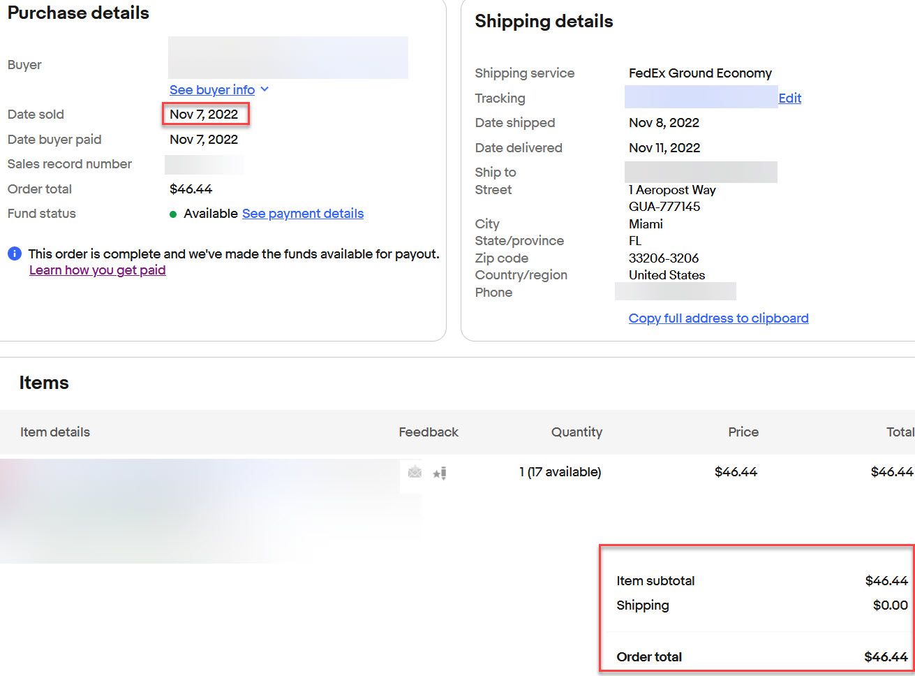 Order from November 7 to a freight forwarder in Miami, no tax.