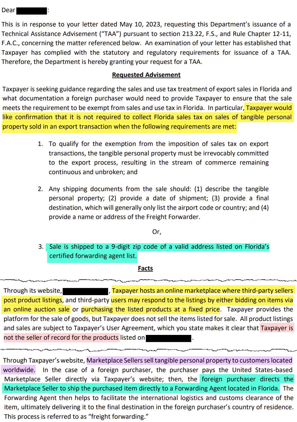 There's no way to know if the redacted marketplace is eBay or not but even if not, this Technical Assistance Advisement would likely also apply to eBay and the reasoning provided in it may have influenced eBay changing how they are handling the tax on sales shipping to Florida freight forwarders again.