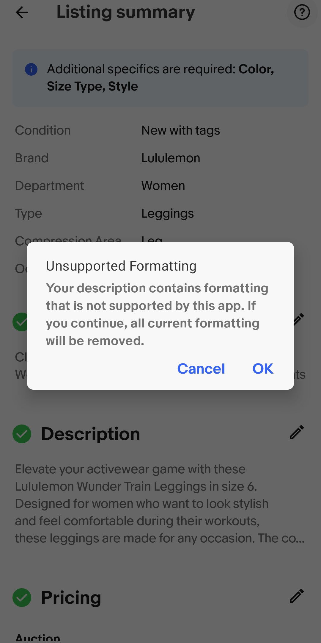 It rewrote my entire description based only on the title and item specifics. I lost everything: the condition description, the details about the decoration, the likely maker, which I did not put in the title or item details because it's just a guess, & more. It didn't even get the measurements right!