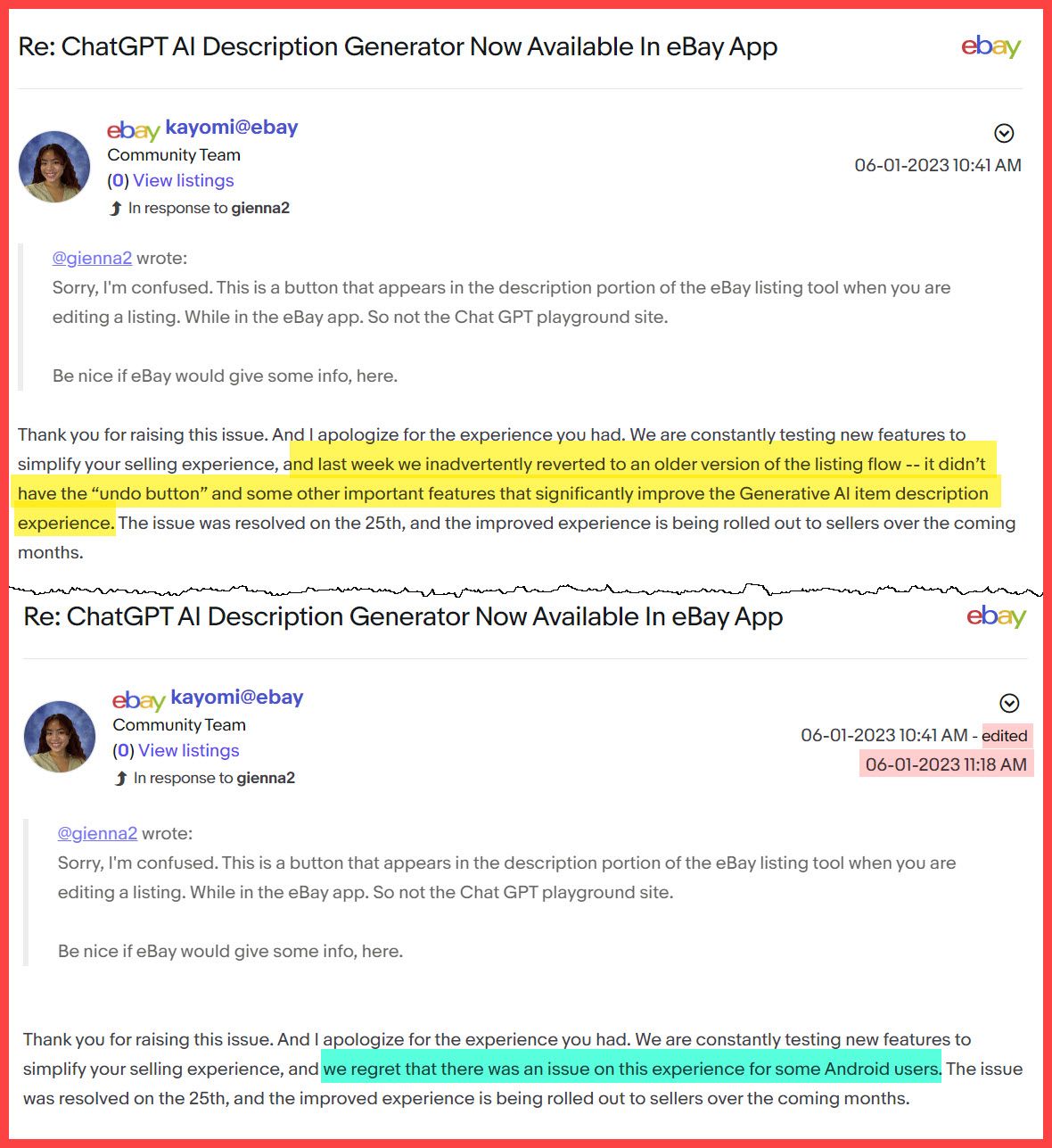 Responding to a seller who complained about their description being overwritten, Kayomi@ebay said:
