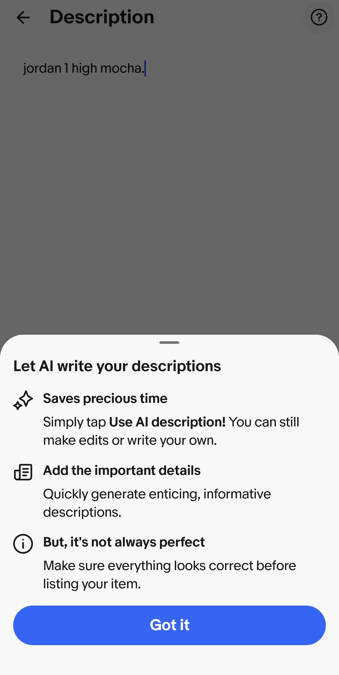 The AI description generator was added to the mobile listing flow earlier this week, allowing sellers to have ChatGPT write their item descriptions at the tap of a button.