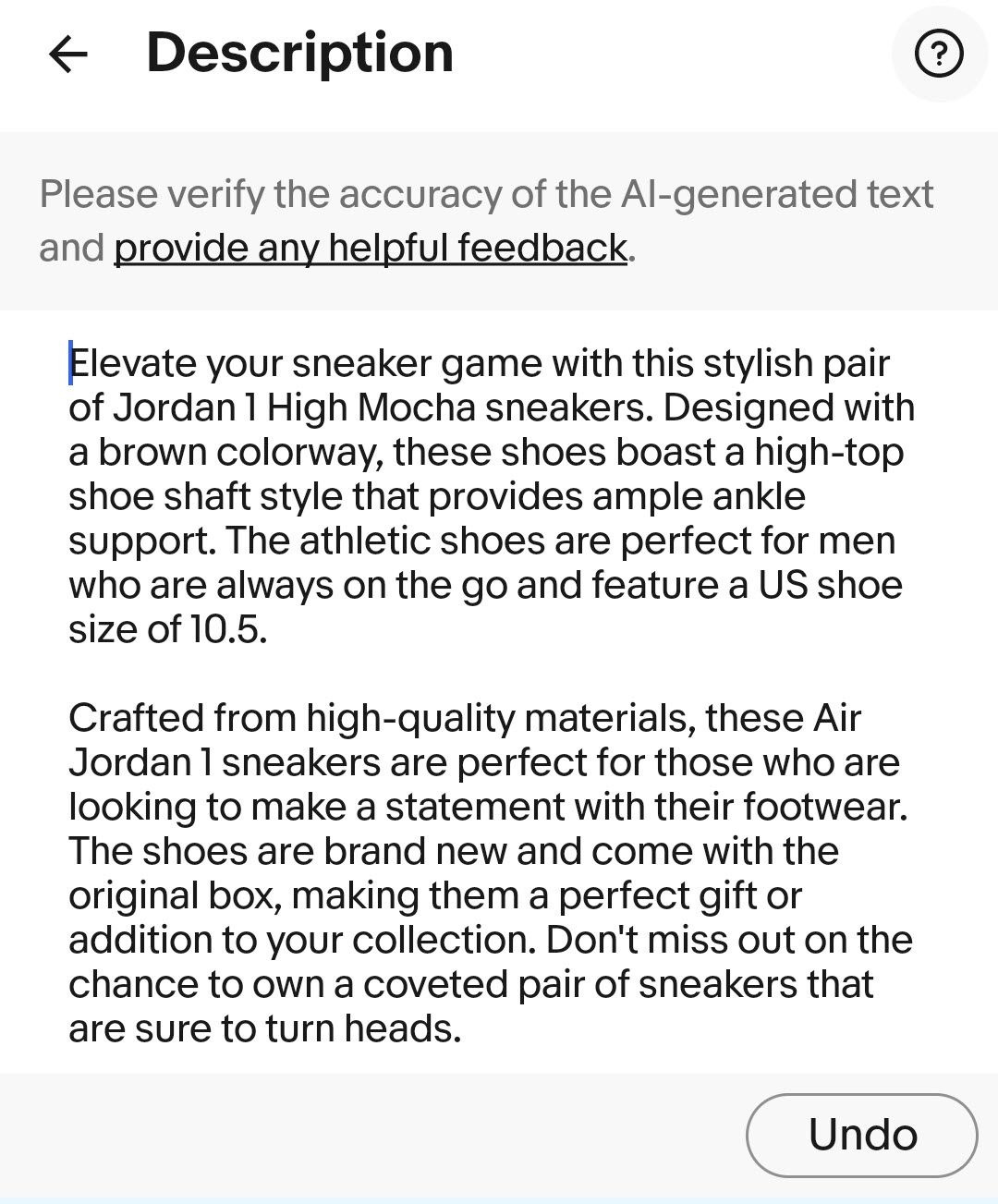 We are constantly testing new features to simplify your selling experience, and last week we inadvertently reverted to an older version of the listing flow -- it didn’t have the “undo button” and some other important features that significantly improve the Generative AI item description experience.