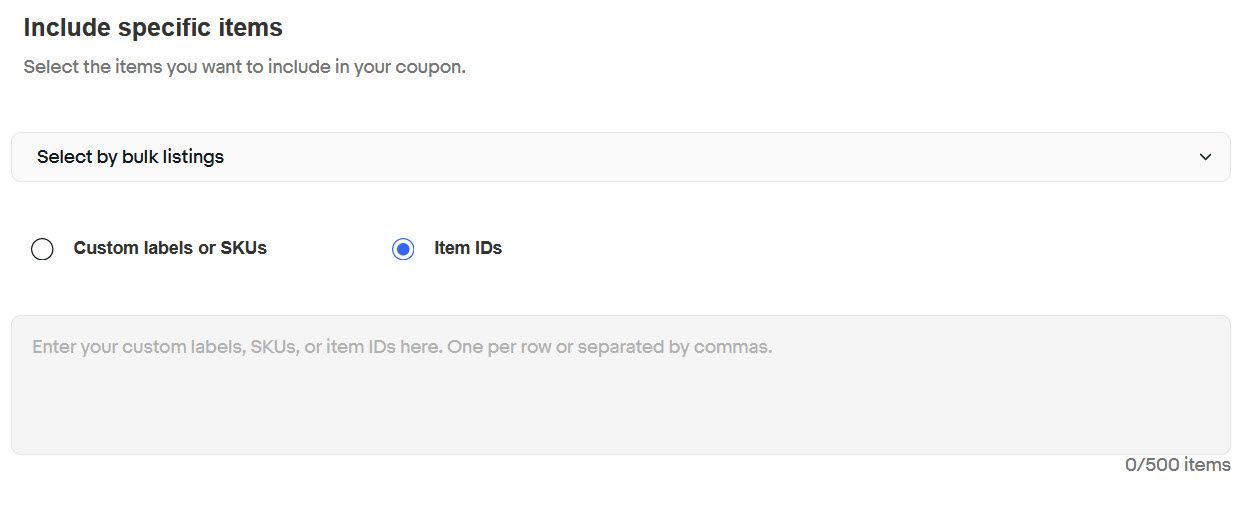 Again it's not specifically mentioned anywhere, but clicking on "select individual listings" opens a menu where you can choose "select by bulk listings" and then enter a list of up to 500 custom labels or item numbers.