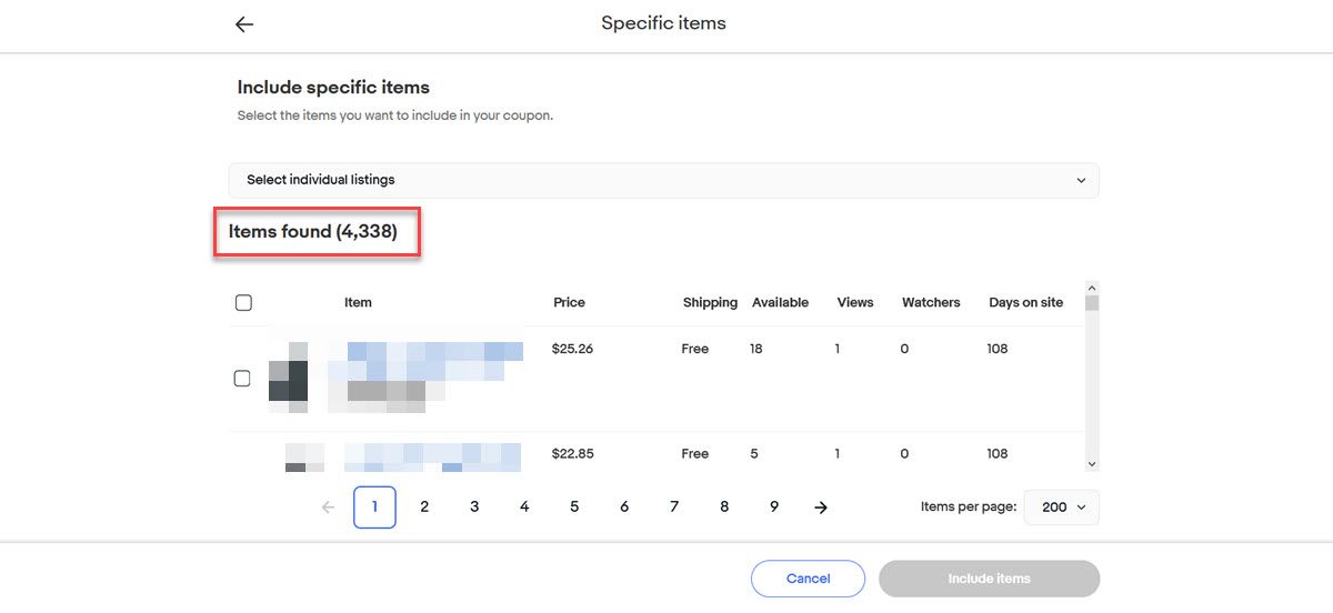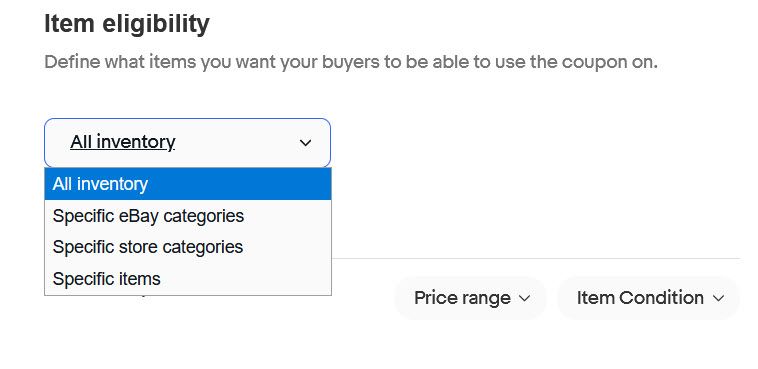 When selecting which items are to be included, you can choose all inventory, eBay category, store category, or individual items. You can also filter by price range and condition.
