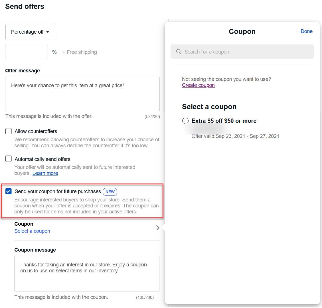 Now when a seller is on the "send offers" screen, they have the option to include a coupon and coupon message. You can either select an existing coupon that you've already set up or create a new coupon.