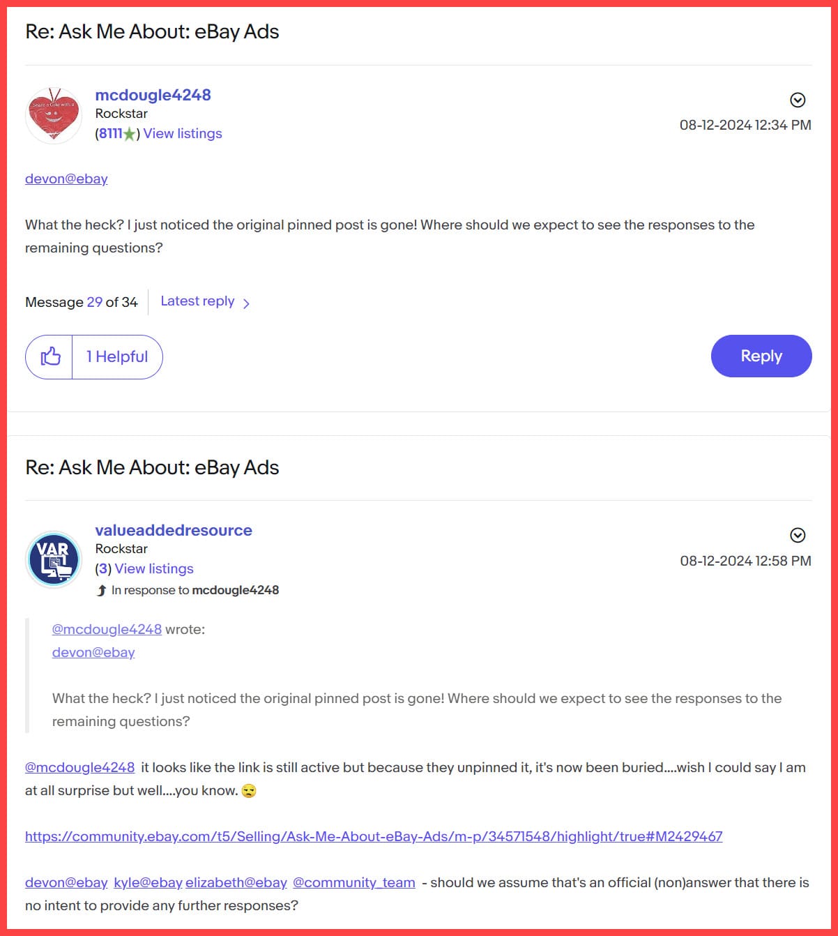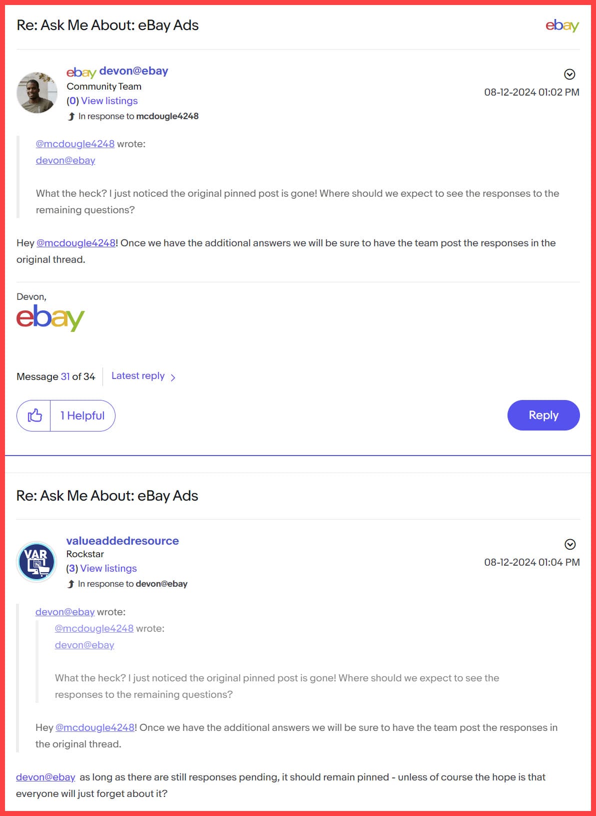 If you're not comfortable posting your questions to the eBay Ads team directly in the community (or you're one of the many sellers who have been banned from the eBay Community by overzealous moderators for spurious reasons in the past) - leave your insights and inquiries in the comments below or contact VAR!