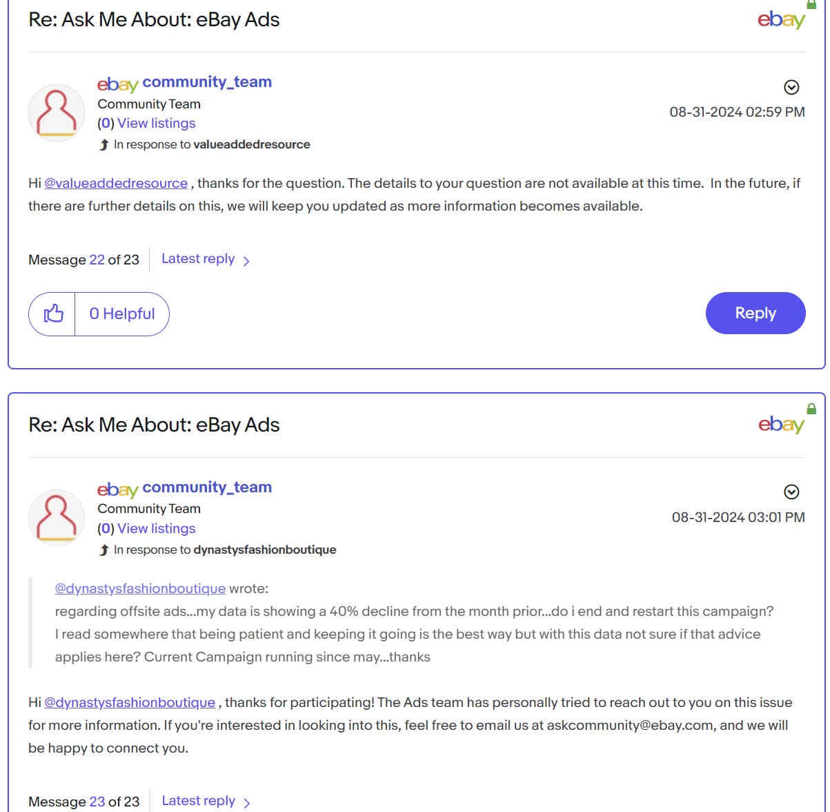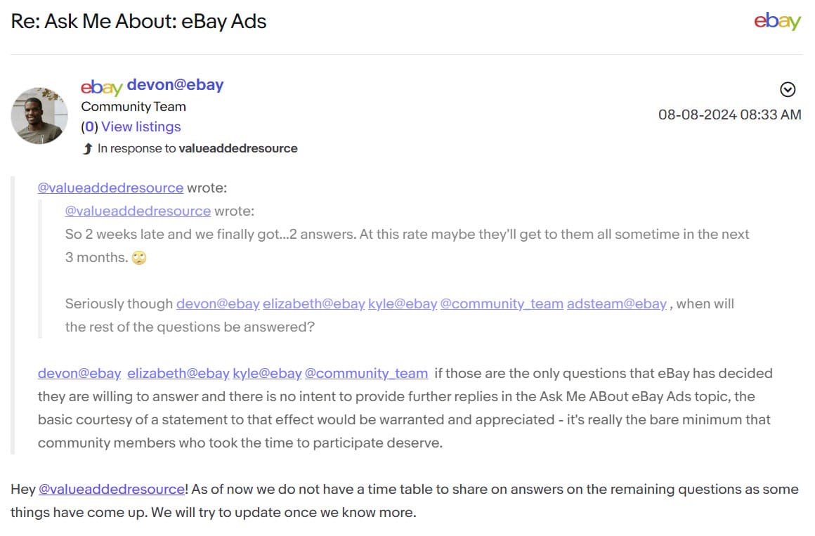 When pressed to provide a more definitive timeframe to address the rest of the questions, or at least give community members who took the time to participate the courtesy of a statement if there was no intent to provide further responses, eBay staff again attempted to brush the topic away by saying "some things have come up" which prevent them from having or sharing an updated time table.