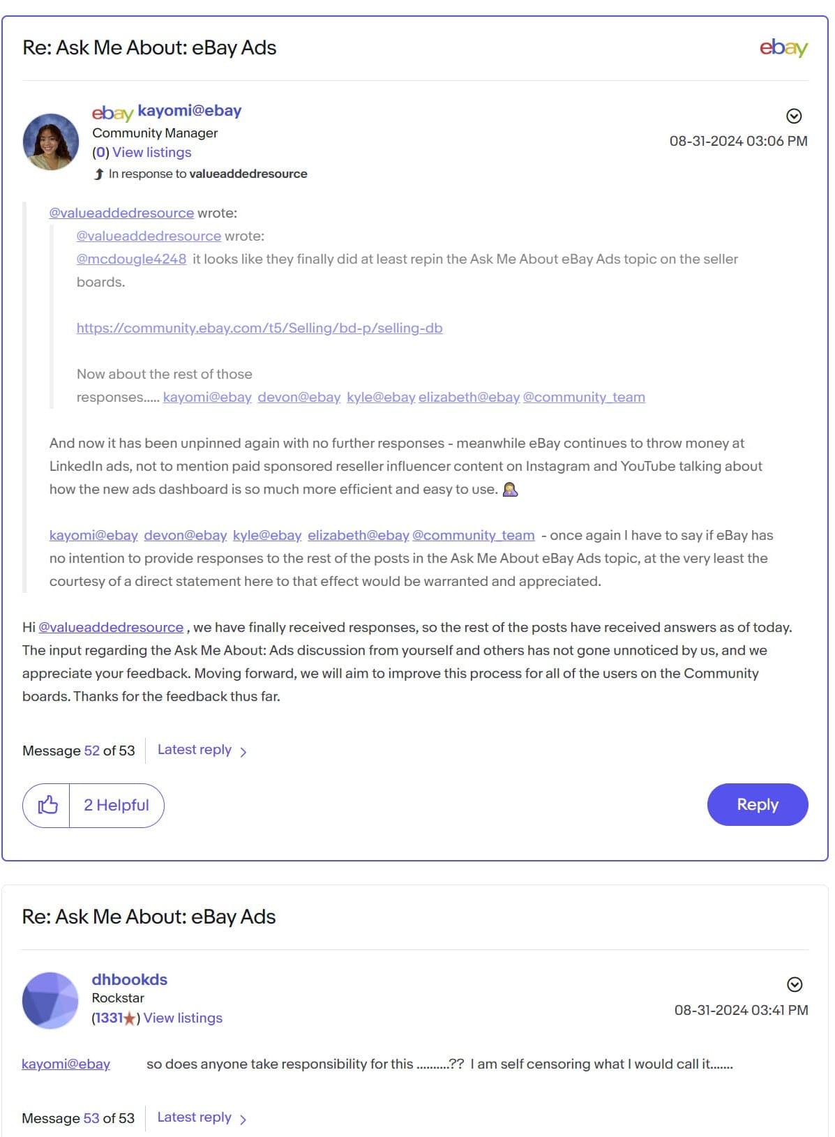 If eBay really wanted to facilitate an engaging and productive discussion on this topic, they would do well to have VP GM of Global Advertising Alex Kazim personally in attendance rather than hiding behind generic "community team" and "ads team" identities.
