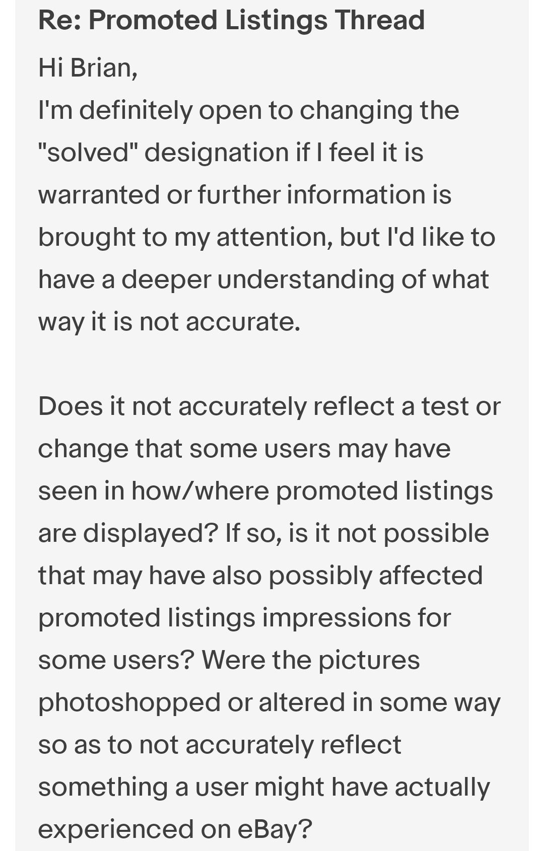 Two weeks later, Sr Manager Seller Advocacy & Engagement Brian Burke posted a response to the thread as well stating it was not a bug, but was in fact a test that eBay had been running which he acknowledged "may impact our ad marketplace."