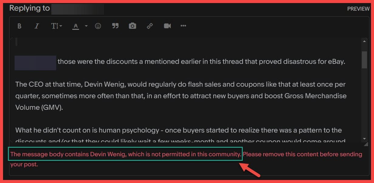 For example, it is forbidden to post the name of eBay's ex-CEO Devin Wenig - and any attempts to do so are met with a message saying that "is not permitted in this community" - though oddly enough, it does allow current CEO Jamie Iannone.