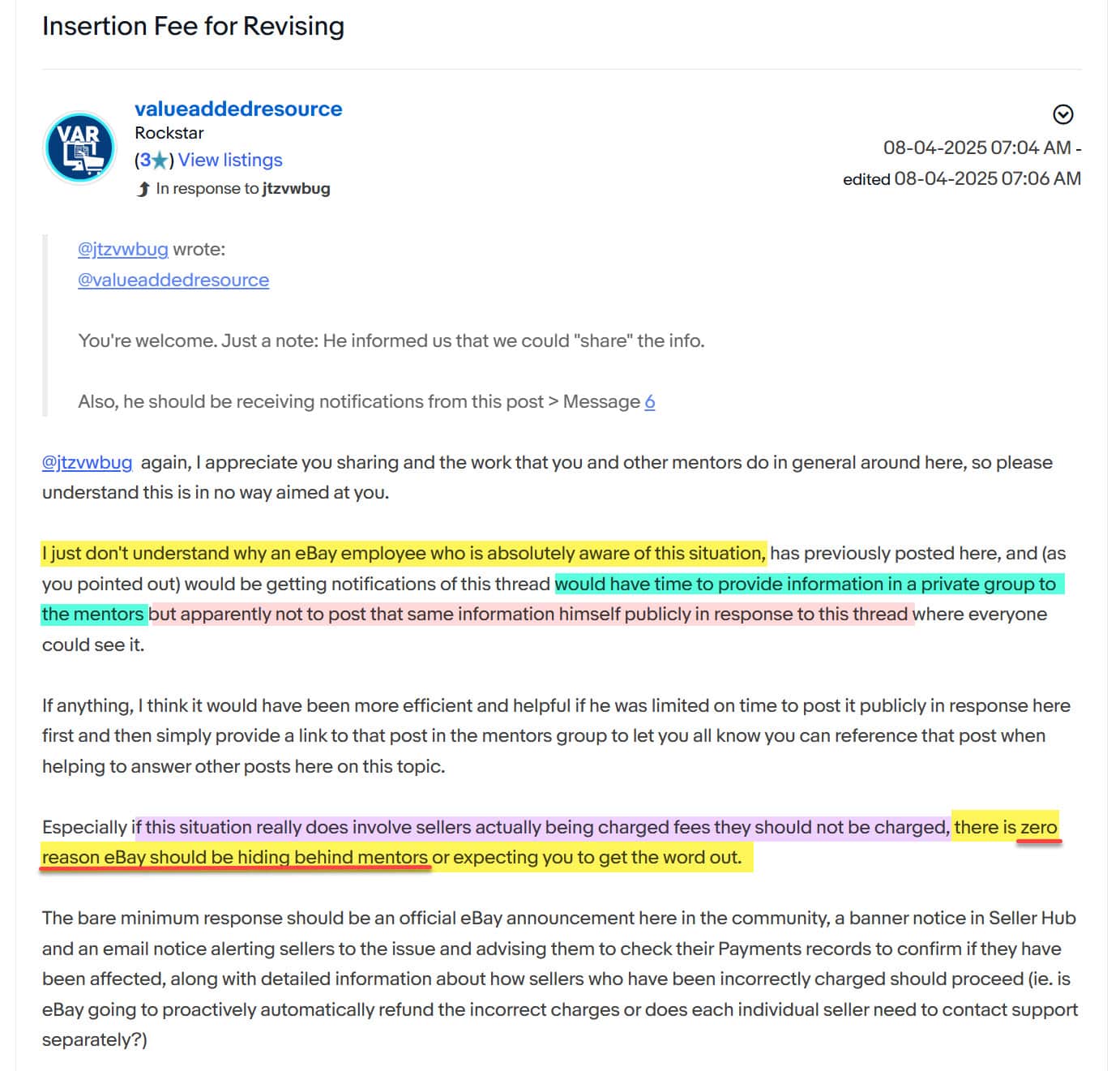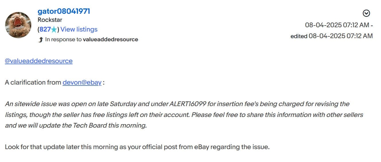 For example, last month when a technical issue caused some sellers to be incorrectly charged insertion fees for editing listings, it was community Mentors who were left to provide an explanation after one of the official eBay employees in the community abandoned the discussion.