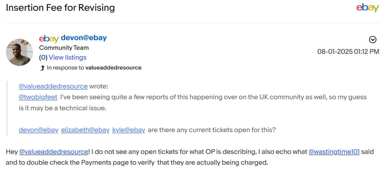 Days later, when multiple sellers had confirmed they were in fact being charged the fees, several Mentors posted to that thread with messages containing an official trouble ticket number and advising that the list of ongoing tech issues posted in the community would be updated later that day but Devon did not come back to the thread, even when tagged to confirm that information.
