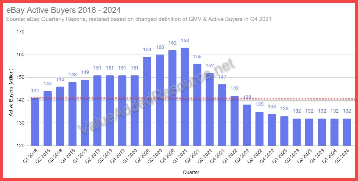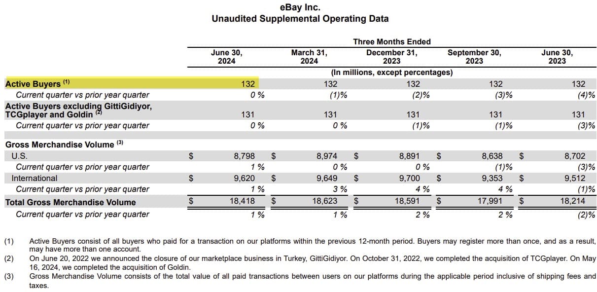 However, eBay's Q2 2024 earnings report showed only 132 Million Active Buyers, marking the 9th consecutive quarter with less Active Buyers since Q1 2018.
