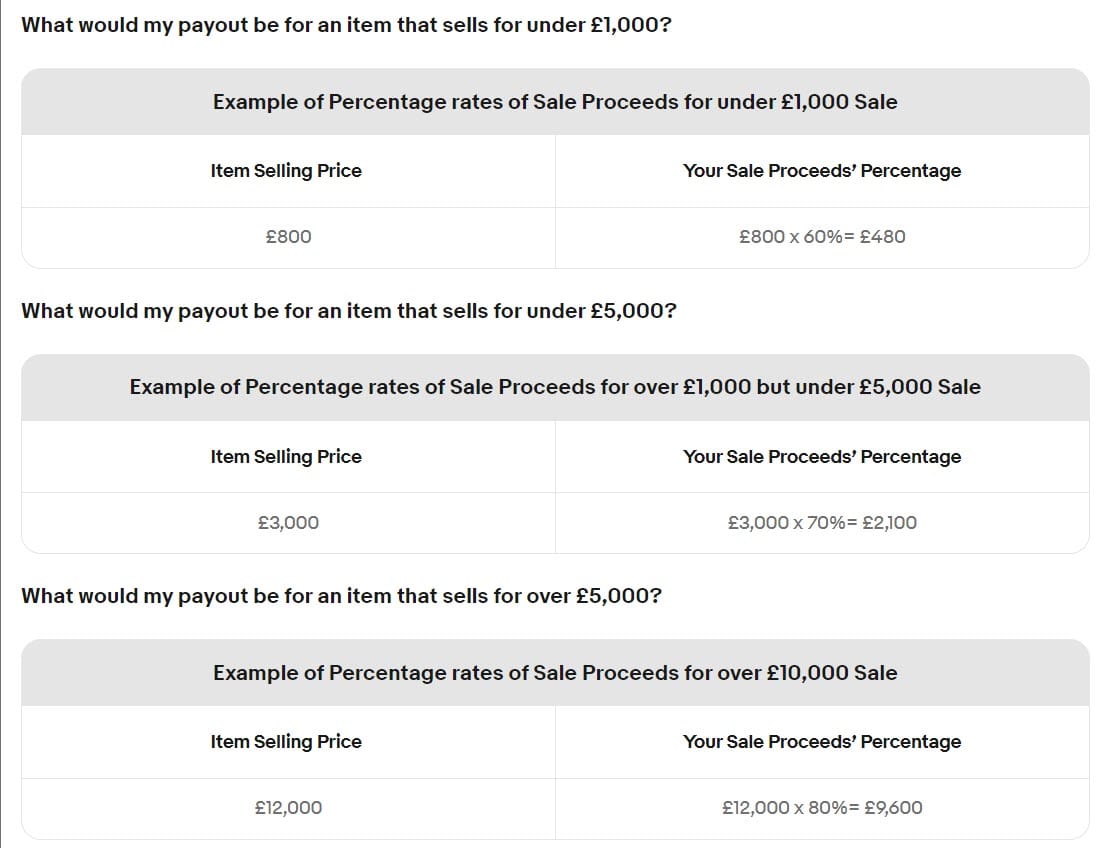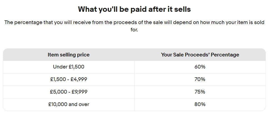 Consignment rates for the UK are similar to the same program in the US, ranging from 20-40% of the sale proceeds paid to the consignment partner - thought there appears to be some discrepancy between the rate chart and the examples given whether the first tier is under £1,500 or under £1,000.