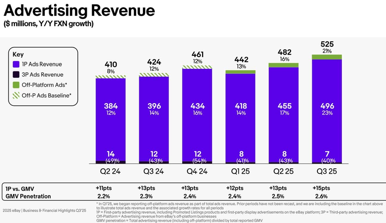 As of Q3 2025, eBay had reported ~$1.37B in first party ad revenue (total of all Promoted Listings ad offerings), meaning they'll have to have brought in ~$630 Million in Q4 to make that Investor Day 2022 prediction.