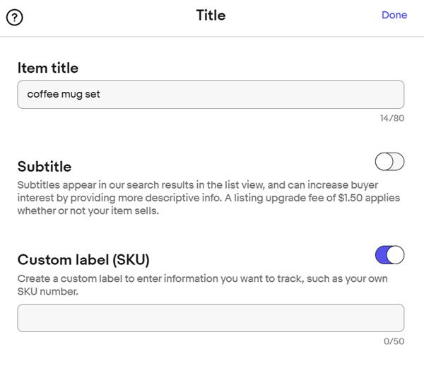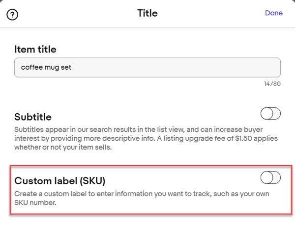 Then select the toggle for Custom Label (SKU) and either enter it on this page or click Done and go back to the main listing page and enter it there.