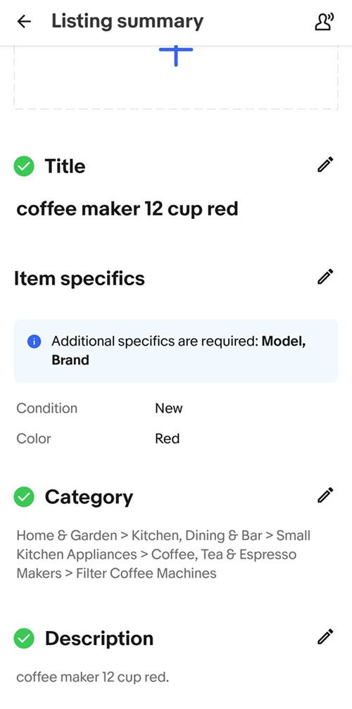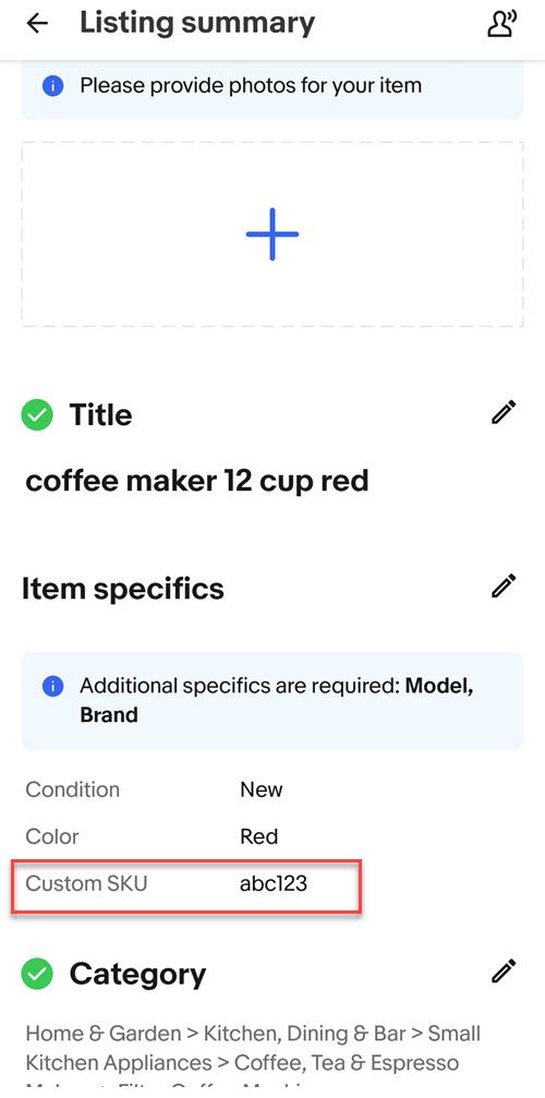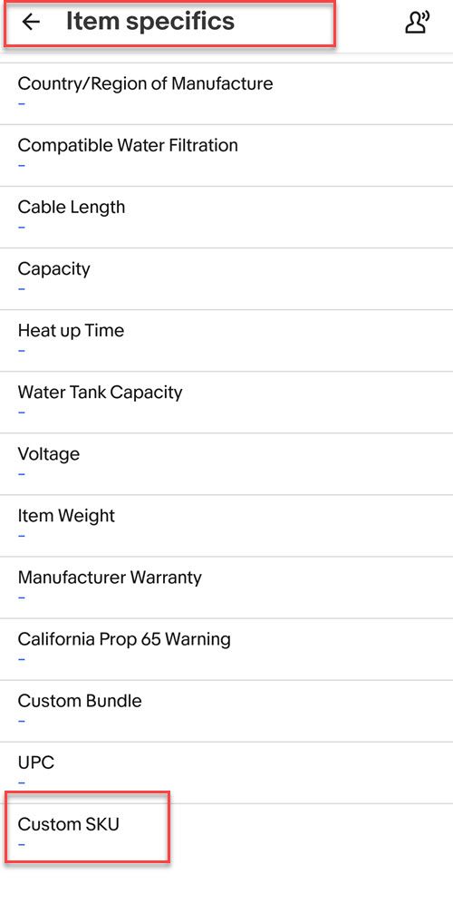 Instead for some inexplicable reason, eBay put Custom Label (SKU) under Item Specifics in the app - all the way at the very bottom where you'll have to scroll past all the required and suggested Item Specifics before you'll see it.
