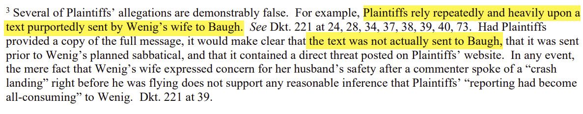 Interestingly, Wenig's team now claims this text was not sent to Baugh, though they have offered no explanation for how Baugh ended up with a copy of it - was it instead sent to one of the other defendants and simply forwarded to Baugh?