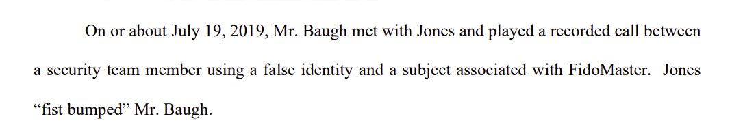 On or about July 19, 2019, Mr. Baugh met with Jones and played a recorded call between a security team member using a false identity and a subject associated with FidoMaster. Jones “fist bumped” Mr. Baugh.