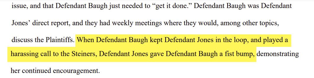 When Defendant Baugh kept Defendant Jones in the loop, and played a harassing call to the Steiners, Defendant Jones gave Defendant Baugh a fist bump, demonstrating her continued encouragement.
