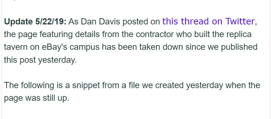 Update 5/22/19: As Dan Davis posted on this thread on Twitter, the page featuring details from the contractor who built the replica tavern on eBay's campus has been taken down since we published this post yesterday.