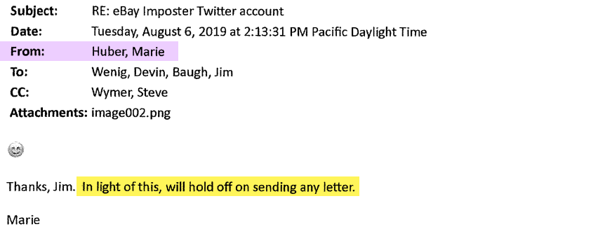 On August 6, 2019 there was a flurry of emails starting with Wenig expressing his desire to see the Fidomaster/unsuckEBAY Twitter account shut down and assigning the task to Baugh, with Chief Legal Officer Marie Oh Huber and Wymer copied.