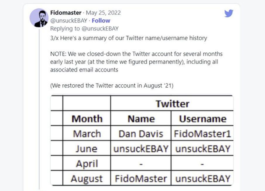 The report noted that FidoMaster1/Dan Davis was an "anonymous Twitter user that posts negative content about eBay and its senior leadership."