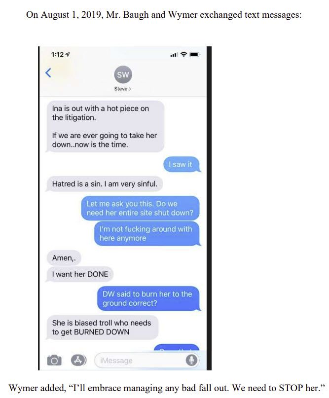 Wenig (Executive 1) exchanged texts with Wymer (Executive 2) on August 1st, saying it was time to "take down" Ina Steiner. Wymer then forwarded that text to Baugh, expressing his "hatred" while committing to "embrace managing any bad fallout."