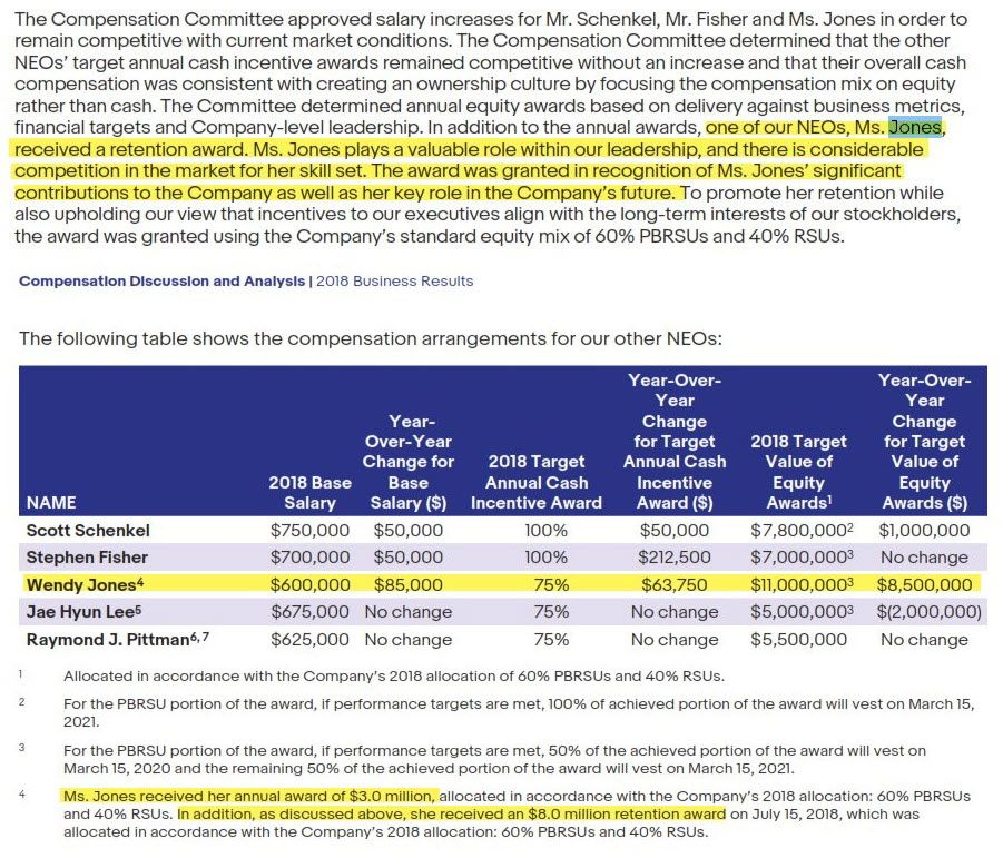 When she departed, she took an $11M+ severance package, in addition to the $11M bonus Wenig had granted her for 2018, $8M of which was a retention bonus.