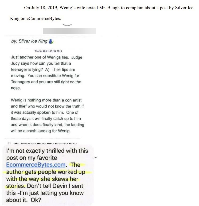 The pressure continued throughout June and July, with Baugh even receiving a text from Wenig's wife, complaining about comments that had been made by other posters on EcommerceBytes.