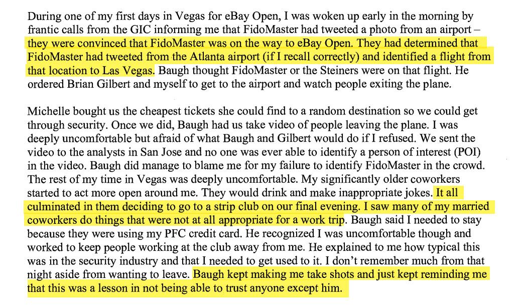 Zea's letter to the court recounts an uncomfortable encounter with Baugh at a Las Vegas strip club after being tasked to fly to eBay Open in 2019 to surveil arrivals at the airport, hoping to catch Fidomaster/unsuckEBAY.