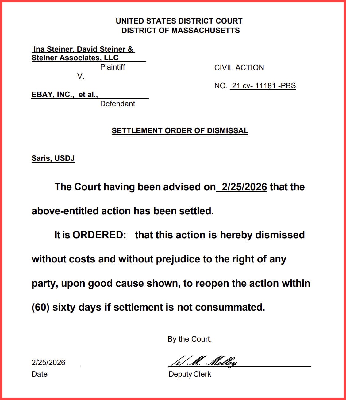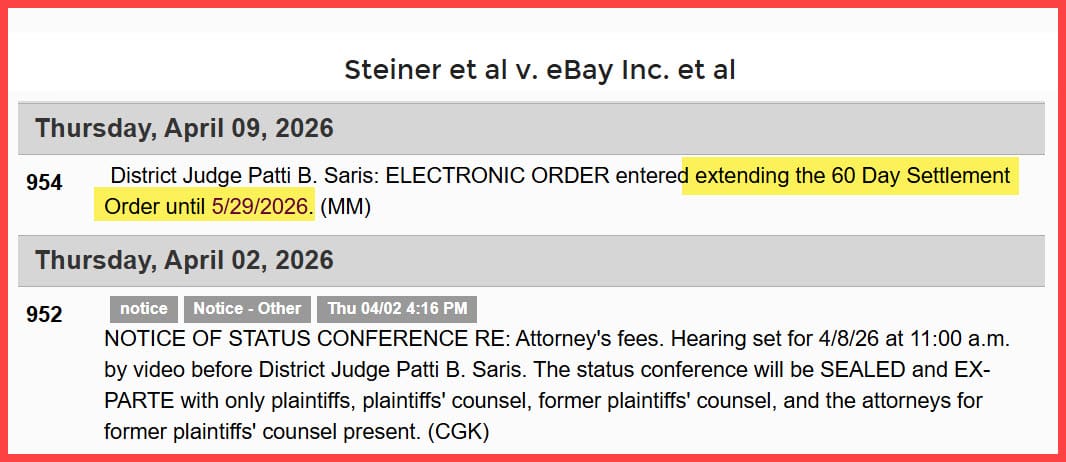 Following a sealed, ex parte status conference regarding outstanding legal fees owed to the Steiners' previous attorney, Rosemary Scapicchio, Judge Saris has extended the deadline to finalize the eBay stalking scandal civil settlement to May 29, 2026.