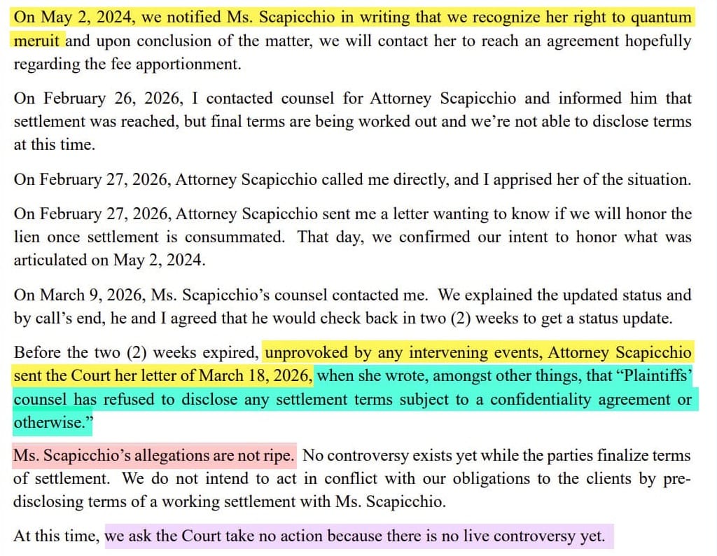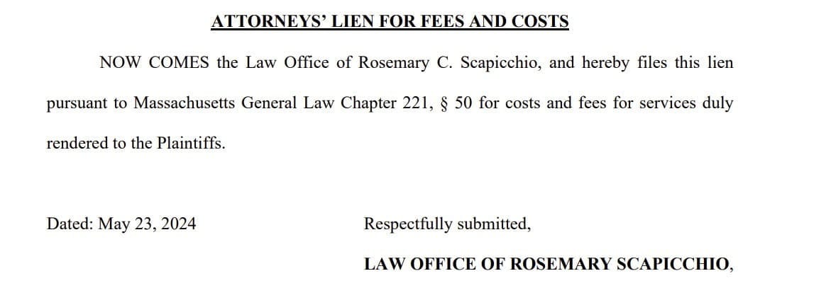 At the time of the switch up, Scapicchio filed a lien on any eventual judgement or settlement to secure payment for the work she had already done on the case.