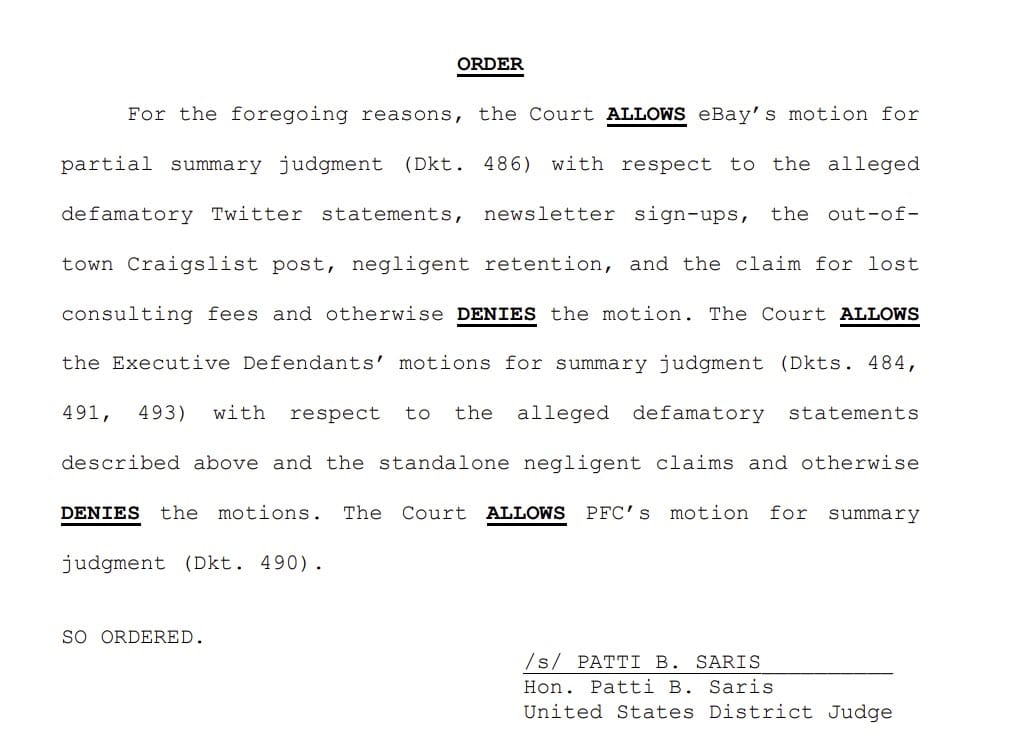 Several claims for defamation including one of two Craigslist ads posted by eBay personell targeting the Steiners as well as threatening tweets, unwanted email newsletter sign ups, and comments calling Ina Steiner's reporting "shoddy", "biased,"bush league", "drivel" and "BS" were denied, while defamation claims related to the second Craiglist ad which falsely purported to be the Steiners looking for "swinging" partners will be allowed to continue.