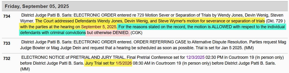 The hearing was in person and a transcript is not yet available, but from ruling notes it appears Judge Saris allowed security personnel who pleaded to criminal charges to be split into a separate trial, but Wenig, Wymer, Jones and eBay will still be tried together.