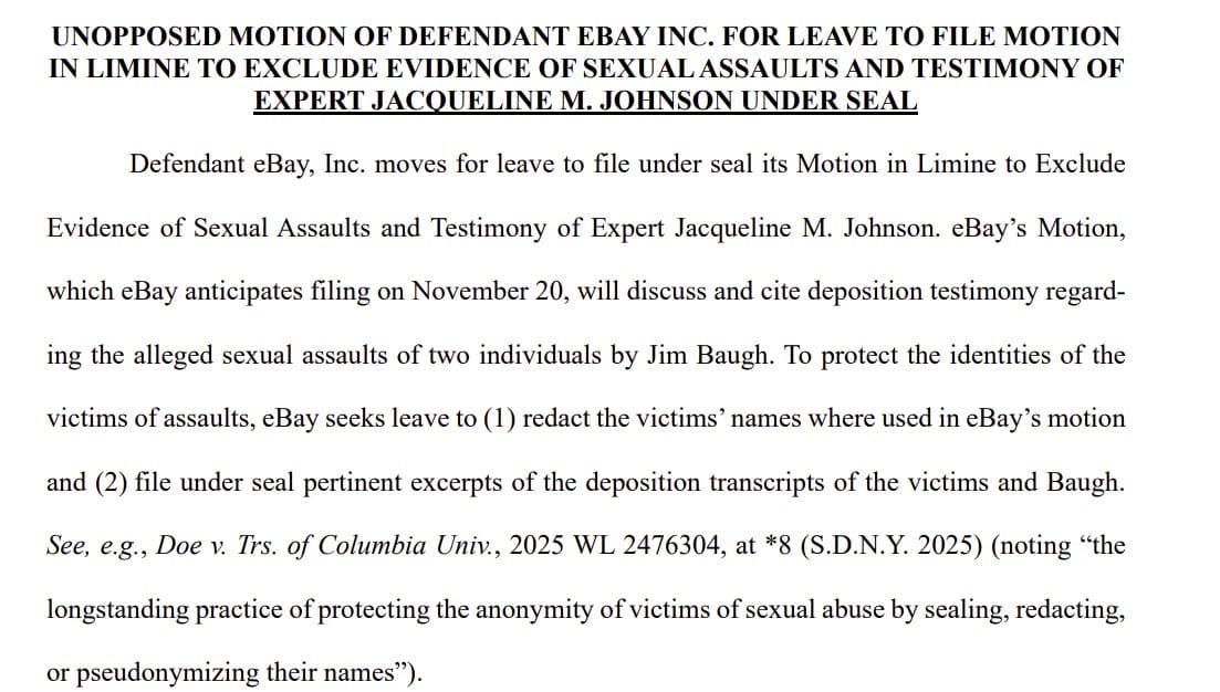 After today's hearing, eBay also filed a request to seal their upcoming Motion in Limine where they plan to ask Judge Saris to exclude evidence related to alleged sexual assaults of two individuals by Jim Baugh and to exclude an expert witness, Jacqueline M. Johnson.