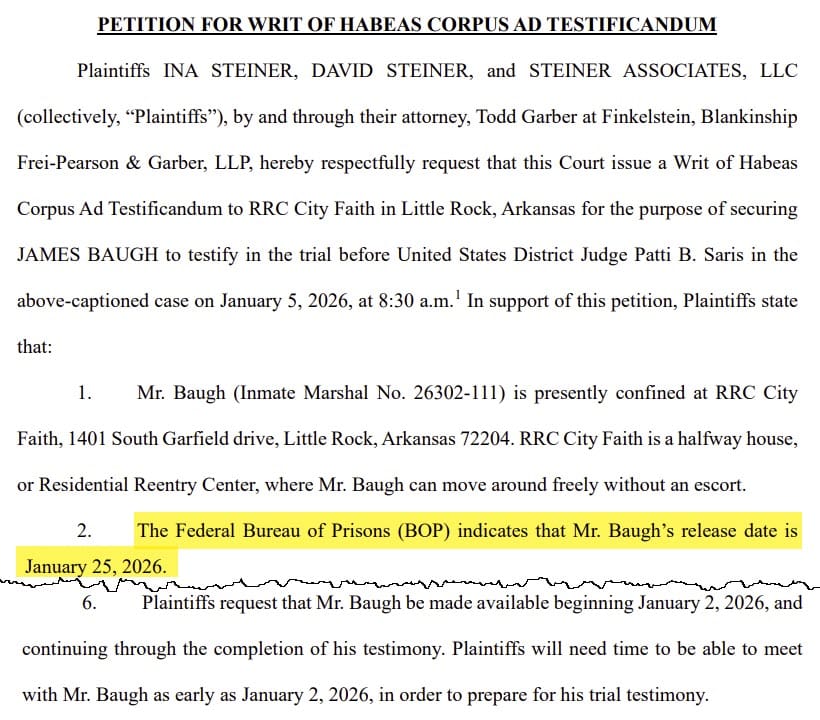 The delay will also render the Steiners' Writ of Habeas Corpus requesting to allow Baugh to travel from Arkansas, where he is currently still in Federal custody per his sentence in the related criminal case, to Massachusetts to testify moot as the new trial date of March 2 will be after his expected release date of January 25, 2026.