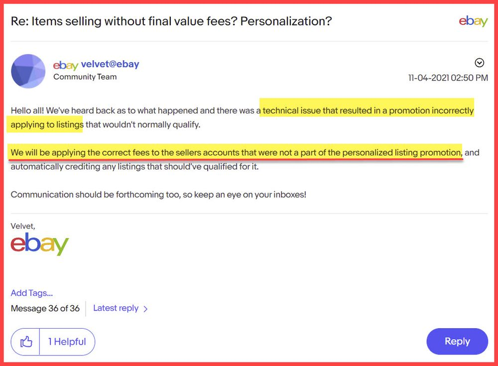 That reminded me of a very similar situation which happened right around this same time last year - eBay had a major billing snafu when they ran a no final value fee promotion that was supposed to only apply to Personalized items, but was instead being applied to many sales for items that should not have qualified as well.