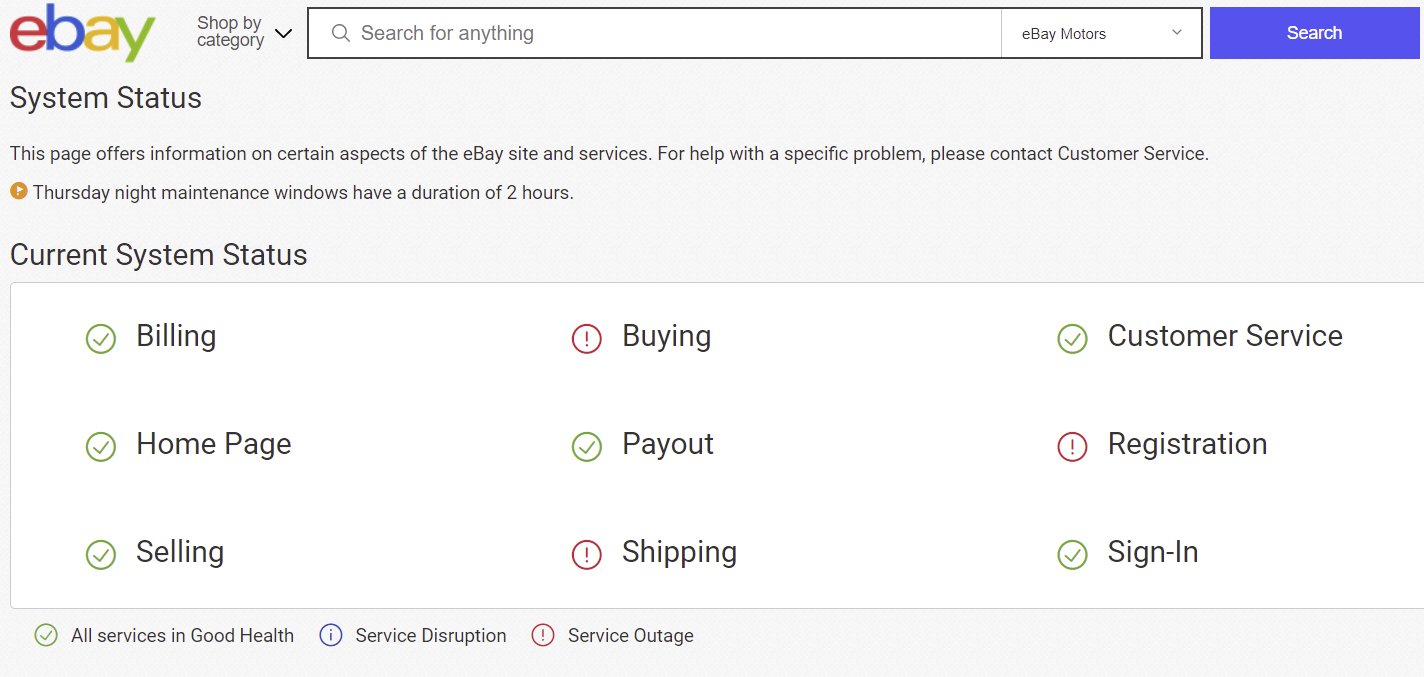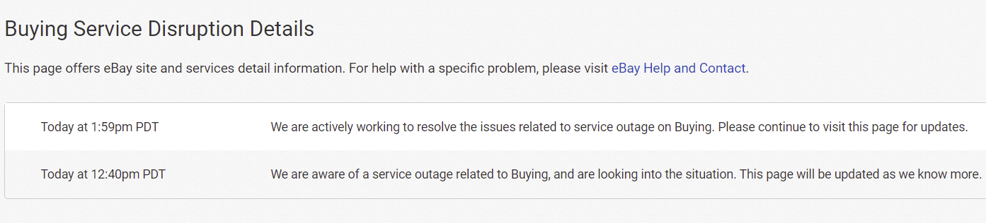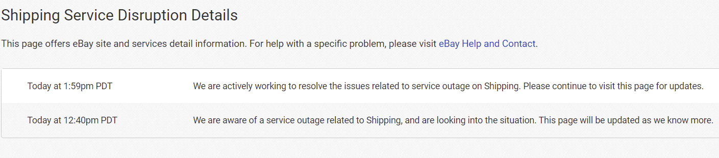 eBay was not specific about the disruptions to Buying and Registration though they have acknowledged the shipping issue.
