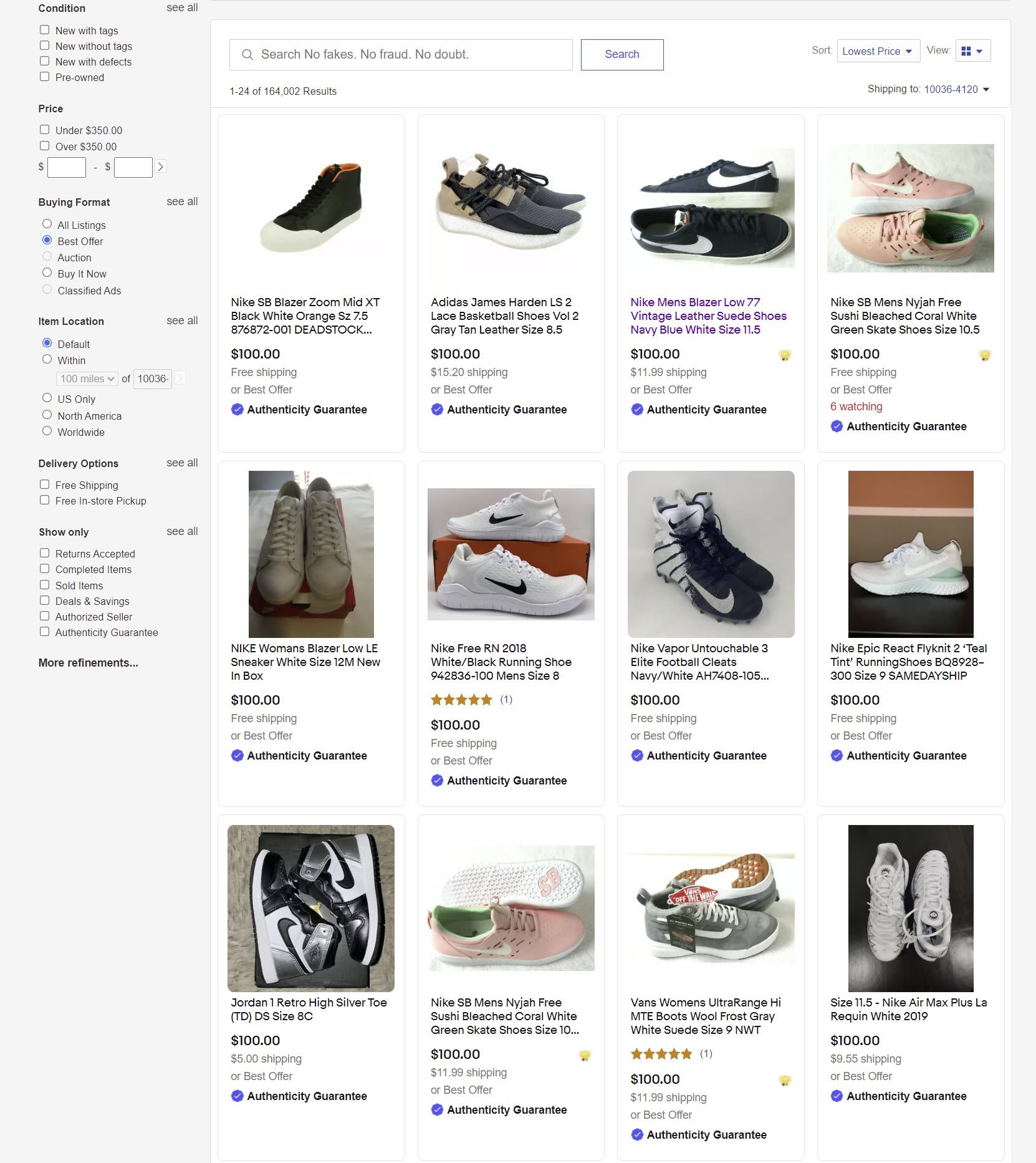 Not that it seemed to help with the delays. As noted in my previous posts about my personal sneaker buying experiences here and here, eBay was still showing Authenticity Guarantee on sneakers well below $150, with some going to the authenticator and others not.