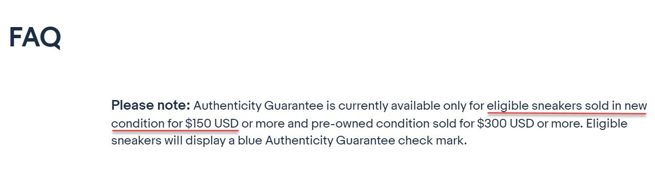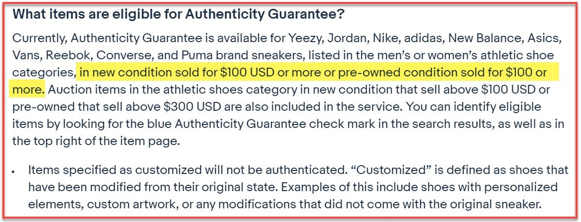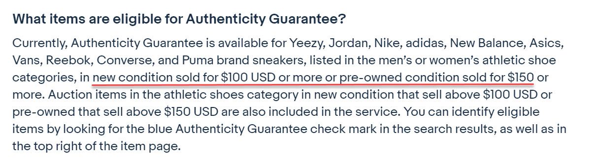 Now as we enter the last month of Q2 2021, I noticed something odd - eBay's FAQ page is still saying the minimum is $150, but browsing through sneakers with Authenticity Guaranteed seems to be showing they may have dropped the minimum to $100 yet again.