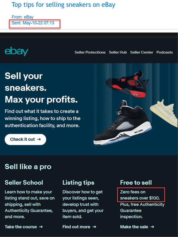 Someone might want to tell the marketing department to swap out the creative on their emails - eBay sent me an email on 5-10-22 with helpful tips to sell sneakers, including "zero fees" which hasn't been a thing since January. 🤦♀️